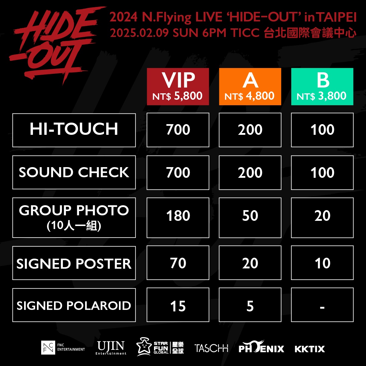 * NT $5,800 티켓 구매자 중 70명 랜덤 추첨 / NT $4,800 티켓 구매자 중 20명 랜덤 추첨 / NT$3,800 티켓 구매자 중 10명 랜덤 추첨 (사전 사인 / 스탭