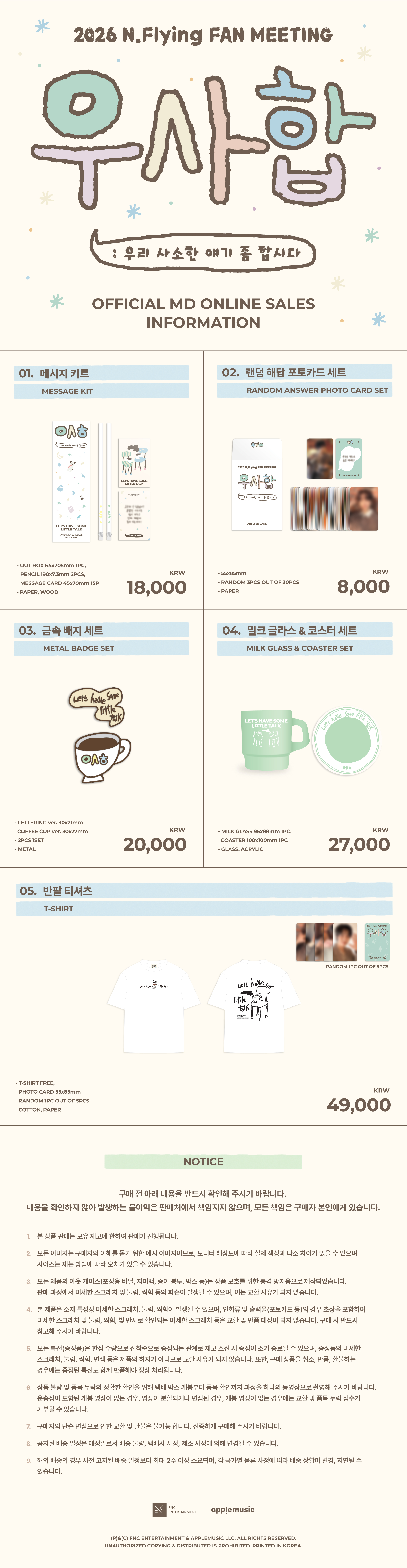 - FNC ENTERTAINMENT의 아티스트 이미지와 MD 상품을 불법 도용할 시 초상권 침해로 법적인 책임을 물을 수 있습니다.