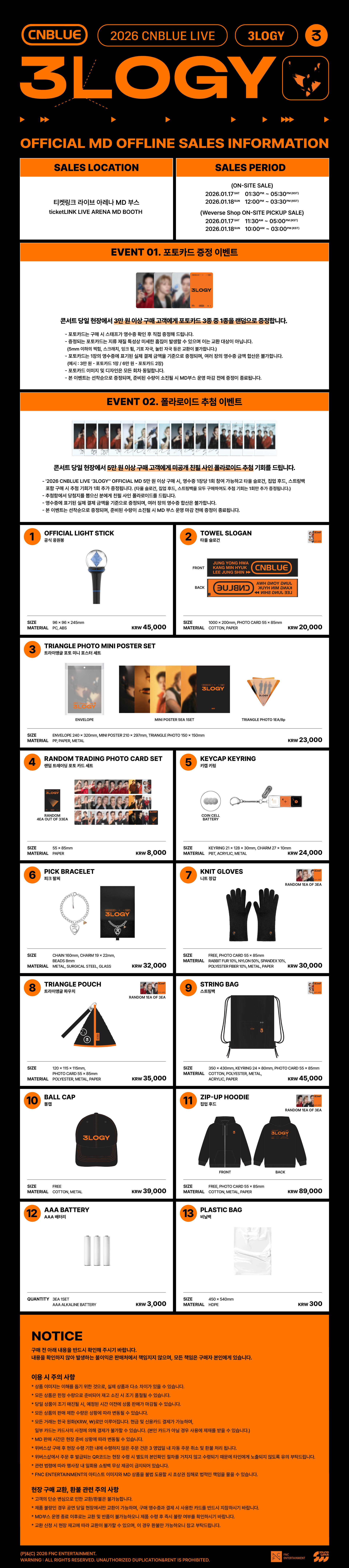 2026 CNBLUE LIVE ‘3LOGY’ OFFICIAL MD 현장 판매를 진행합니다. 현장 구매 및 위버스샵 구매 후 현장 수령, 2가지 방식으로 구매 가능합니다. 구매 시 하단의 유의사항을 꼭 확인하여 주시기 바랍니다.
